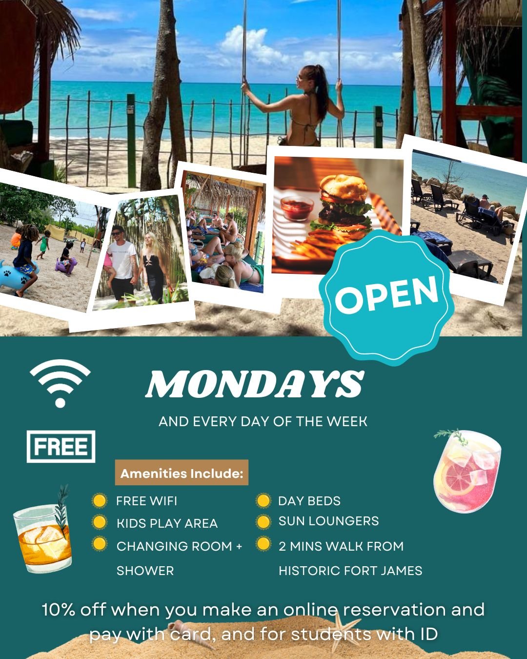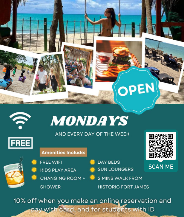 We are a stay-all-day lifestyle concept & experiential beach day in a sustainable, eco-conscious setting! Work, play & relax! Antigua's social hangout - dance, play games, take a dip in the clear blue ocean or just laze about on sun beds! Great locally sourced food and drinks, located at the historic Fort James! Features: - Lounge, dining, cabanas, stage & event, kids play areas - Fast & Free WIFI - Shower, toilets, changing rooms & bag storage. - Beach activities and board games for the whole family - kayaking, horse riding etc. - Baby sitting service for little ones. Sample the best of Antigua! In all we do, we want Treehouse Beach Club to be fun, wholesome and sustainable. I