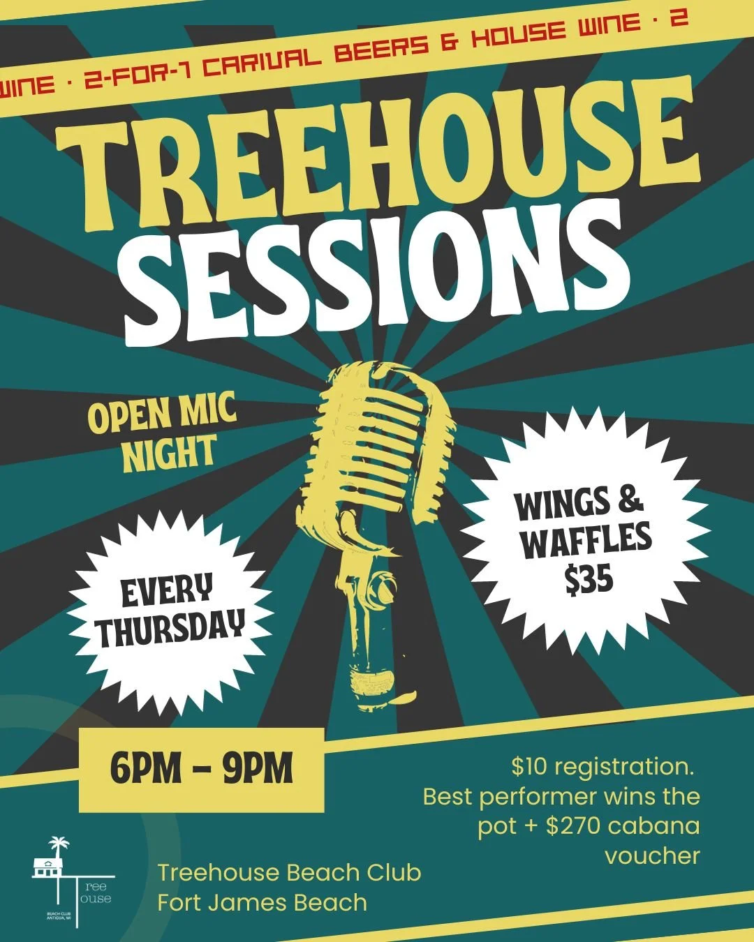 Are you a budding musician or a successful one? Showcase your skills in front of an appreciative crowd, every Thursday at Treehouse! All levels of talent welcome! To perform you have to pay a $10 EC registration fee on the day. However, best performer takes away the entire pot of registration fees plus a $270 gift voucher to use the Treehouse Cabana for them and up to 3 friends. Drinks and food included to the value of $270 EC…