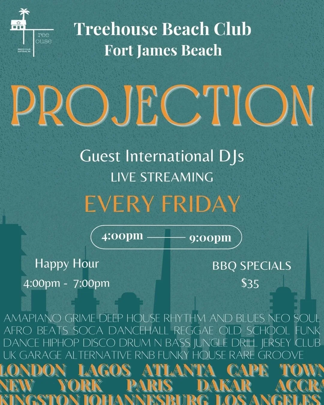 At Treehouse we love everything Antiguan and local but we also love to fuse local with the rest of the world! So we have reached out to DJs all over the world and we are going to be streaming them live on a large PROJECTION to bring sounds from all over the world!